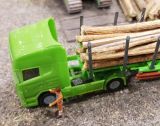 Eigenbau eines Holztransporter nach einem H0-Bild. Als Basis diente ein Herpa Modell. Das Führerhaus wurde abgegossen und abgeändert. Der Aufbau ist ein Eigenbau. Das Modell bekam rollende Räder und der Kranaufbau ist von einem H0-Modell das entsprechend abgeändert wurde. Die Stützen sind ausziehbar.