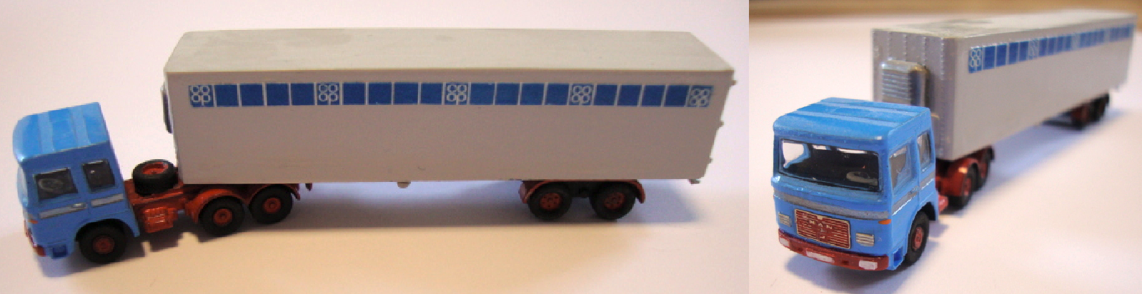 Umgebauter Sattelzug auf Basis eines Atlas Lkw. Die Zugmaschine ist von Atlas und der Trailer ist ein Eigenbau aus Kunststoff. Die Decals wurden selber hergestellt.