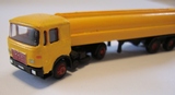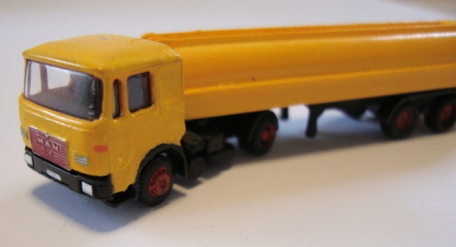 MAN 13.230 F Tank-Sattelzug. Als Basis diente der MAN F90 von Lemke (miNis). Das Führerhaus wurde entsprechend abgeändert und der Tankauflieger von einem anderen Modell passend lackiert..