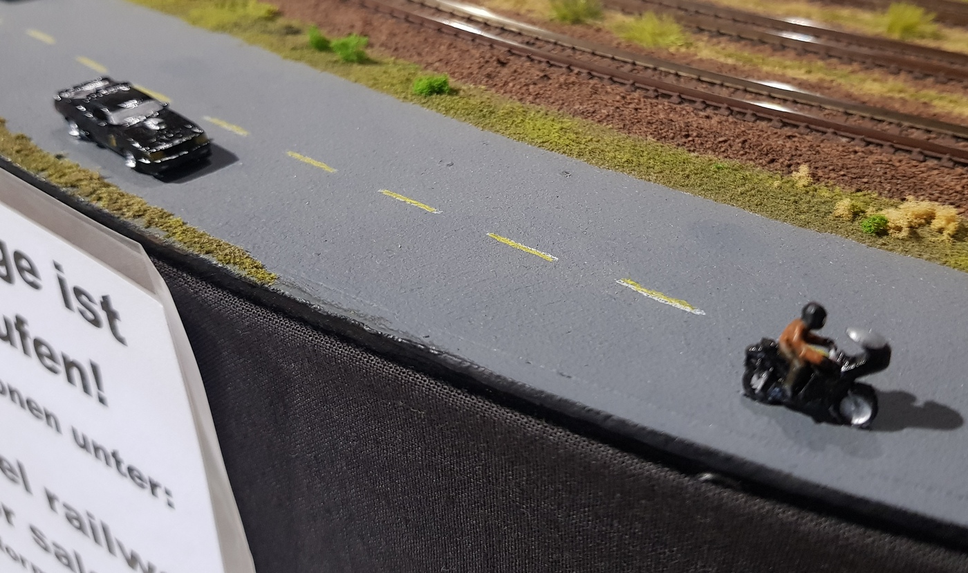Szene aus "Duell" Figuren: --- Fahrzeuge: - Peterbilt 281/351 von Trainworx (Nr. 59095) - 71' Plymouth Valiant Gebäude: --- |