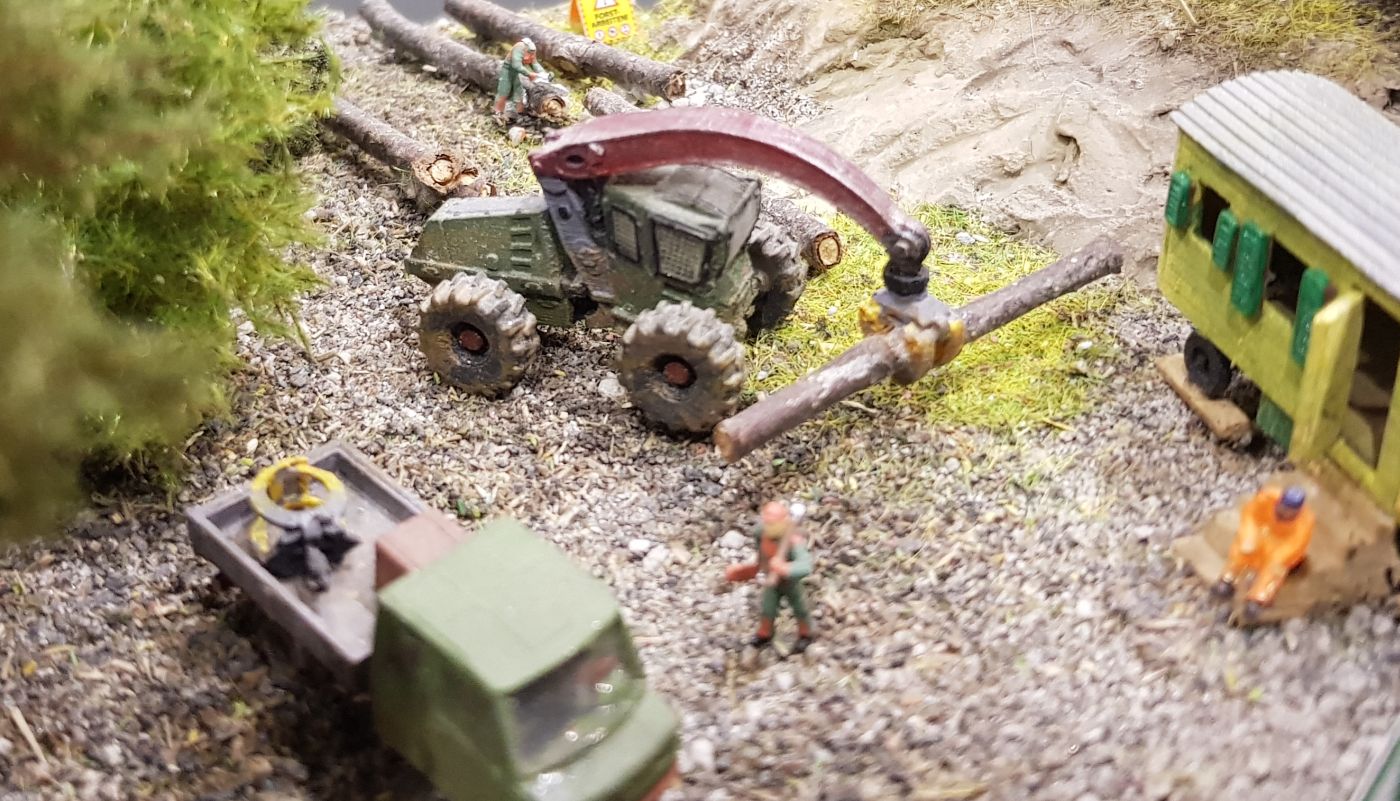 Waldarbeitsgerät, ein Skidder aus einem 3D-Drucker von shapeways. Der Skidder soll die gefällten Bäume vom Schlagplatz an den Berabeitung- und Verladeplatz schleppen. Eine entsprechende Farbgebung wurde mit Revelll Aqua Color durchgeführt.