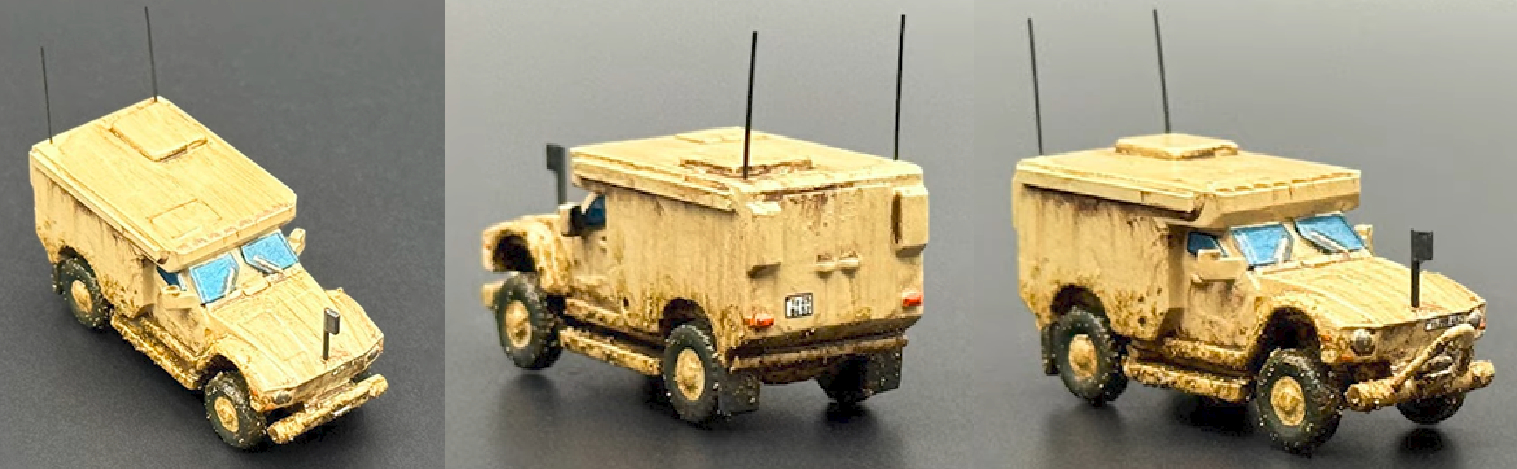 Hier wurde ein Cougar MRAP 4x4 eines 3D Druck Anbieter verfeinert. Das Fahrzeug wurde fein bemalt, beschmutzt und Scheiben aus Micro Kristal Claer eingesetzt.