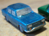 Eigenbau eines BMW 700 Limousine. Die obligatorischen Talbotspiegel aus den 60er Jahren sind aus Stecknadelspitzen gemacht. Das Karosserieunterteil ist aus einer Polystyrolplatte ausgesägt und zurecht geschliffen worden. Das Dach wurde aus einem Ätzteil hergestellt.