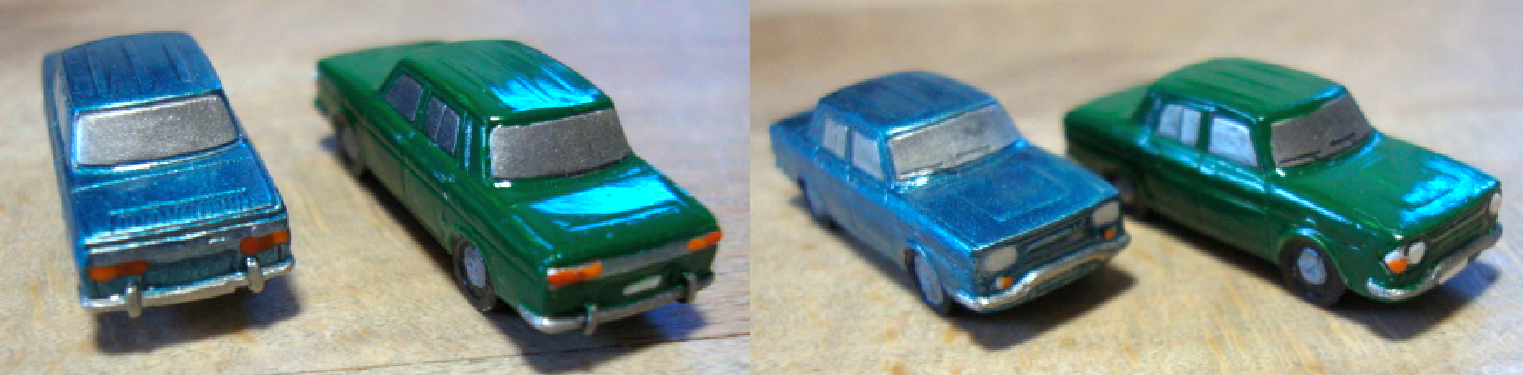 Hier wurde aus alten Formen des Fiat/Seat 124 von Ibertren ein Lada 1500 gebastelt. Mittels neuer Farbe, Kristall Klear für die Scheiben und Decals wurden diese Straßenfahrzeuge erstellt.