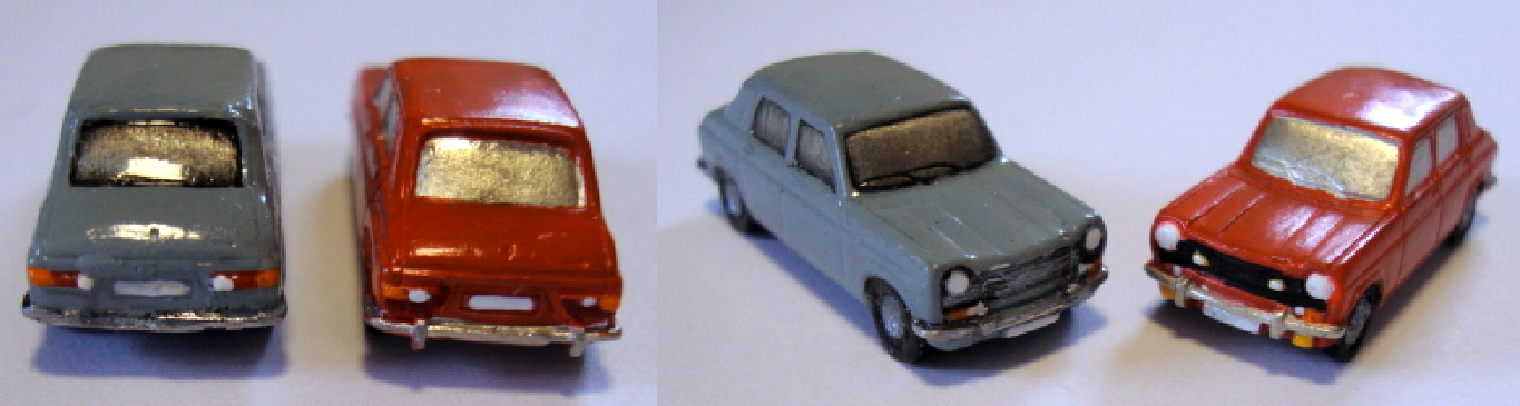 Simca 1100 und 1100 Ti. Einmal von 1967 ohne Zusatzscheinwerfer und schmaler Heckleuchte, sowie als Ti Version von 1973. Als Basis dienten die Metall Modelle von "YL". Die Modelle wurden entsprechen lackiert.