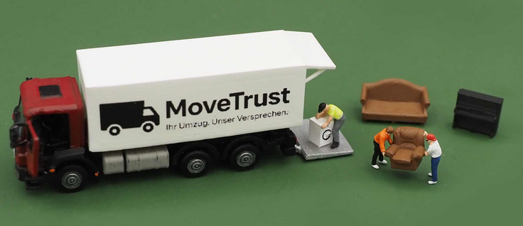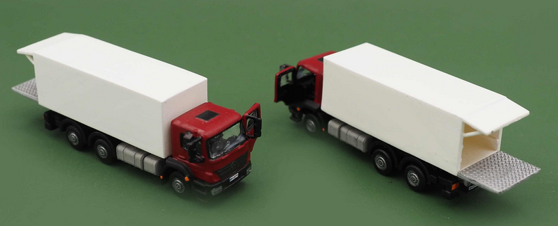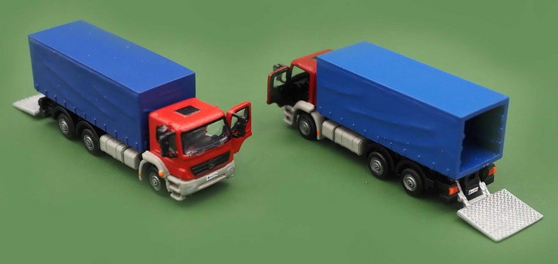 MB Axor LKW Koffer offen, Fahrertüre offen, Ladebordwand unten mit Szenerie Umzug, handkoloriert + Decals .