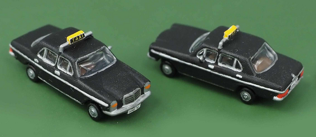 Mercedes Benz /8 Taxi (MB W115 2. Serie (1975); Farbe Schwarz, handkoloriert + Decal Kühlergrill, Taxi.